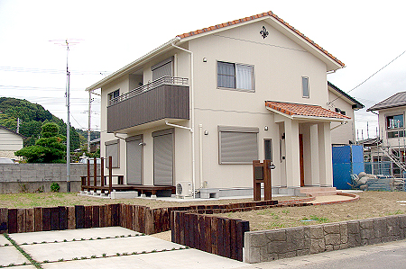 子育て世代応援住宅です。ウッドデッキ上の鉄棒のような物は布団干しです。