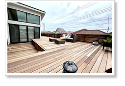 傾斜地を利用した半地下のガレージです。奥にはお施主さまごだわりのレンガづくりのワイン保管庫があります。屋上にはウッドデッキが広がっています。マットグロッソ産イタウバ材を使用しました。耐久性がありながら肌ざわりが好評な南米産の木材です。